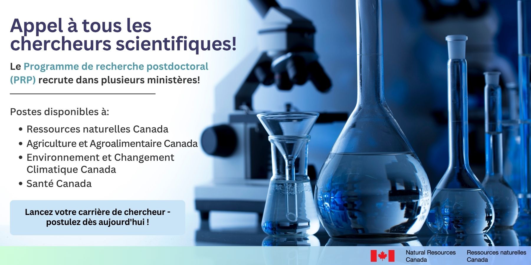 Ressources naturelles Canada, en collaboration avec Agriculture et Agroalimentaire Canada, Environnement et Changement climatique Canada, et Santé Canada, est à la recherche de jeunes diplômés dans un domaine des sciences naturelles pour participer au Programme de recherche postdoctorale (PRP).